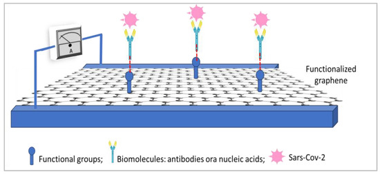 Graphene-containing electrochemical biosensors can be used advantageously for the detection of the SARS-CoV-2 virus. The detection mechanism involves the immobilization of specific biomolecules on the surface of the graphene, capable of interacting with the virus, causing a change in the electrical properties of the graphene [47]. To be used in these biosensors, graphene must first be functionalized, creating functional groups on its surface, such as carboxylic acids, amines, and thiols, etc., capable of reacting and therefore immobilizing biomolecules, such as antibodies or nucleic acids, sensitive to SARS-CoV-2 (Figure 2).