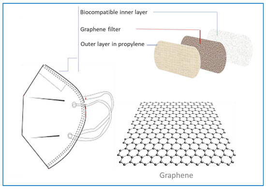 Graphene, as is known, is a nanomaterial consisting of a monoatomic layer of carbon atoms, arranged to form a hexagonal lattice and its structure can be defined as two-dimensional, as there are only two dimensions of the plane [63,64]. By exploiting the antimicrobial, antistatic, and electrically conductive properties of the nanomaterial, researchers have developed face masks with antiviral properties that can be sterilized and reused. We need to dwell on this type of mask.