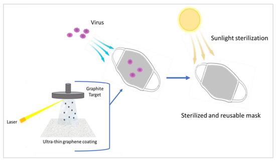 In laboratory tests, the surfaces of these masks were found to be highly hydrophobic and capable of causing incoming water droplets to bounce back. These masks have photothermal properties which give them two important prerogatives: the ability to self-sterilize and virucidal efficacy (inactivation of the virus). The presence of graphene, in fact, determines a photothermal effect, i.e., the production of heat following the absorption of light. The surface temperature of the functional mask, irradiated by the sun’s rays, can rapidly rise to over 80 °C, making the masks reusable. As is known, most viruses cannot survive at high temperatures, therefore, the solar radiation to which the surface of the graphene layer is subjected causes it to reach temperatures of up to 80 °C which consequently allow the inactivation of the virus. In particular, the results of such studies found that the antimicrobial efficiency of graphene material, with sunlight sterilization, could improve by 99% within 15–20 min [68].