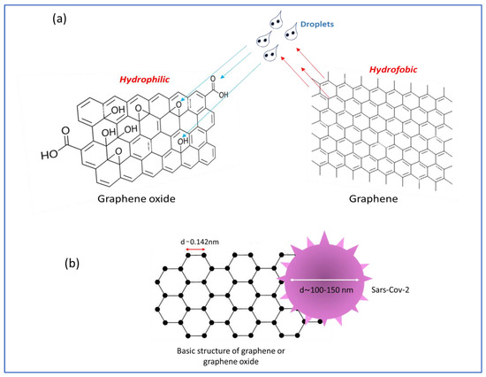 (a) Hydrophilic and hydrophobic action, respectively, of graphene oxide and graphene, with respect to droplets; (b) size of virus and carbon rings.