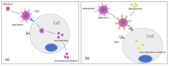 Lysenko et al. (2018) [76] proposed that nanoparticles adsorbed on the cell surface induce an alteration of the membrane with consequent contrast to the attachment and penetration of the virus. Most often, nanoparticles work by altering the structure of the capsid protein and reducing viral activity. The capsid of the SARS-CoV-2 virus consists of four structural proteins, known as Spike, Envelope, Membrane, and Nucleocapsid. The large Spike (S) protein, which forms a kind of crown on the surface of the viral particles, acts as a real “anchor” which allows the virus to dock to a receptor expressed on the membrane of the host cells, the receptor ACE2 (Angiotensin-Converting Enzyme 2), allowing the initiation of entry of the virus into the cell. Once penetrated inside, the virus exploits the functional mechanisms of the cell to multiply, which dies, releasing millions of new viruses (Figure 6a). The attack between the Spike protein and the AC2 cell receptor, in the presence of nanoparticles, is prevented with the consequent impossibility of the virus to enter the cell and multiply (Figure 6b).
