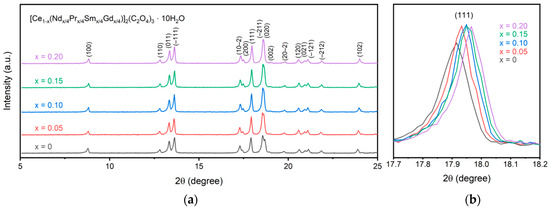 Figure 1 displays the XRD patterns for the synthesized oxalate precursors. All peaks are assigned to the metal oxalate with no secondary phases present. Specifically, all synthesized samples form in the P21/c space group as decahydrate oxalates. Since all lanthanides form with the same space group, a single-phase oxalate structure is precipitated during multication synthesis rather than a mixture of individual metal oxalates. An increase in doping concentration leads to a shift in the pattern to higher 2θ values, representing a decrease in the lattice parameters. This can specifically be seen in the (111) peak in Figure 1b. All of the metal cations sit in 9-fold coordination with a +3 charge. The ionic radius of the cations decreases from cerium at 1.196 Å to 1.107 Å for gadolinium. As the doping increases, the average ionic radius within the material decreases, thus shifting the (111) peak to higher 2θ values and shrinking the a and c lattice parameters. The changes in lattice parameters follow the same trend as observed by Alemayehu et al. for gadolinium-doped cerium oxalate and are recorded in Table 1 [12]. As seen, the a and c lattice parameters shrink while b and β stay relatively constant, and a reduction in volume is observed. This is consistent with previous work on lanthanide oxalates that showed a decrease in the a and c parameters with an increase in atomic number through gadolinium for the lanthanides and only a slight change in b and β [18]. The low doping concentrations used here prevent a noticeable trend from being observed for the b and β parameters.