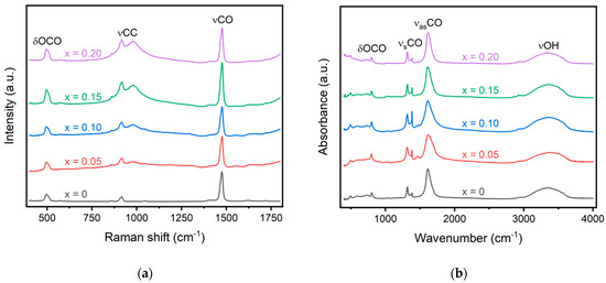 Raman and Fourier-transform infrared spectroscopy can be coupled together to investigate the bonding nature within a material. Three distinct bands are typically observed in Raman spectroscopy of the lanthanide oxalates: vCO at ~1480 cm−1, corresponding to the symmetric stretching of the C–O single and double bonds; vCC at ~920 cm−1, the stretching of the C–C single bond; and δOCO at ~500 cm−1, associated with the bending of the O–C–O bond [19,20]. The δOCO band at ~500 cm−1 contains a greater contribution from the metal–oxygen stretching motion and, therefore, will display larger shifts compared to the other bands identified with Raman spectroscopy [21]. While Tamain et al. did not observe a shift between the Pr, Nd, and Sm oxalates for either the vCO or δOCO bands, they did observe a shift for Gd [19]. Morris and Hobart, however, observed a shift to higher wavenumbers with increasing atomic numbers for all rare earth oxalates up to Er [21]. Raman spectroscopy for the synthesized oxalates is shown in Figure 2a, and the recorded values for the vCO, vCC, and δOCO bands are recorded in Table 2. The most intense band is observed for all oxalates around 1475 cm−1 for the vCO band. The shift observed for this band is less than a wavenumber and significantly less than what is observed for gadolinium oxalate. The dopant concentration may be too low to significantly alter the bonding environment, causing only very small shifts. This is also similar to results obtained by Tamain et al., who did not observe any shift for Pr, Nd, or Sm oxalates compared to Ce oxalates [19]. Additionally, no doublet is observed for the vCO band at 1475 cm−1. A doublet was previously reported by Tamain et al. and Clavier et al. and was described with two distinct oxalate ions in the unit cell [19,22]. The lack of a doublet further confirms the single-phase purity of the oxalate rather than a mixture of individual oxalates. A small shift in the vCO band to a higher wavenumber is observed with increased doping concentration. This is in line with previously published results that showed smaller dopants lead to a shift in the spectrum to higher wavenumbers [18,19]. Additionally, a peak around 980 cm−1 is observed for all doped samples, which is not observed in the individual oxalates. This band was previously identified using Raman spectroscopy by Tamain et al. and is not visible in FTIR [19].