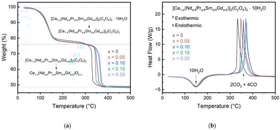 The thermal decomposition of individual rare earth oxalates is well-recorded in the literature [23,24,25,26]. Depending on the element, the decomposition can proceed through dehydration and then decomposition of the oxalate directly into the oxide or through a carbonate intermediate. During the dehydration step, intermediate oxalates may occur with less water if there is a non-equivalency in the water molecule bond strength [25]. This was observed for Gd, Sm, and Nd oxalates depending on the initial water concentration in the molecule. Dehydration of Ce and Pr oxalates in air proceeds in one step. Notably, the Ce oxalate decomposition temperature is well below the other rare earth oxalates at ~300 °C compared to ~450 °C for Nd. The decomposition of the oxalate proceeds through the breaking of the RE-O bond [25]. The bond length decreases with an increase in the atomic number. Therefore, as the doping concentration increases, the decomposition temperature will increase due to the substitution of cerium for elements with smaller radii and bond lengths. While some rare earth oxalates decompose through a dioxycarbonate intermediate, it has been previously shown that multicomponent oxalates undergo non-additive decomposition behavior and thus are not expected to form intermediates [24]. Since the maximum doping concentration is 20%, it is expected that the decomposition of the oxalates will behave more like cerium oxalate and only have two decomposition steps.