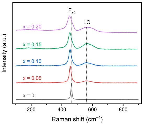 Raman spectroscopy can investigate the local structure and disorder of the material in contrast to XRD, which investigates the long-range order of the structure. In pure CeO2, only one mode, F2g, is active and centered at ~460 cm−1, although two additional modes centered around 250 cm−1 and 600 cm−1 may be observed due to defects [32]. The F2g breathing mode corresponds to the CeO8 octahedra with a central stationary Ce atom surrounded by 8 O2− ions. In the cubic RE2O3 structure, 22 active Raman modes are predicted. However, due to the low intensity, not all modes are able to be identified, and most focus on the Fg mode centered at ~350 cm−1. Upon doping CeO2 with trivalent cations, changes in the F2g mode, the introduction of oxygen vacancy modes, and the introduction of the Fg mode of the lower symmetry cubic RE2O3 phase are tracked. Doping with trivalent cations, which introduce vacancies into the structure, will cause a reduction in the average coordination number of Ce, causing a slight red shift in the F2g mode. As the dopant concentration increases, the red shift will increase until high doping concentrations, at which the red shift is offset by a blue shift, caused by the expansion of the lattice. Additionally, F2g broadens, decreases in intensity, and becomes progressively more asymmetric with increasing RE doping due to alterations in the surrounding oxygen ions [30]. A peak corresponding to oxygen vacancies can be seen in doped ceria systems around 570 cm−1 and is ascribed to oxygen vacancies that form to maintain charge neutrality when trivalent dopants are introduced [33,34]. A band at 600 cm−1 that may be observed is instead ascribed to intrinsic vacancies due to the presence of Ce3+ rather than other rare earth dopants [35]. In a trivalent-doped ceria system, if the fluorite structure is maintained, no peak should be observed at ~350 cm−1, which corresponds to the lower symmetry C-type structure.