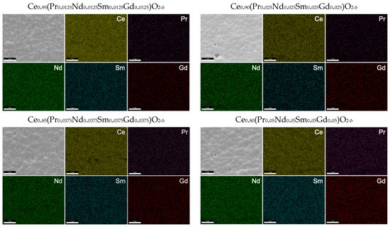 Scanning electron microscopy (SEM) and energy dispersive spectroscopy (EDS) were performed on the sintered pellets, as shown in Figure 6. The calculated grain size for the samples ranges from 1.2 μm to 1.5 μm. Using the oxalate method, the required sintering temperature is much lower than for the solid-state method, thus allowing for the synthesis of pellets with smaller grain sizes. The elements appear to be well distributed throughout the material, and no dopant segregation along the grain boundaries appears to be present at this scale. The 15% doped sample does show some areas with relatively lower Ce concentration in the EDS scan, although this may be attributed to the small pores and uneven surface of the pellets. Due to the similar L𝛼 energy levels and small dopant concentrations that lead to large errors within EDS calculations, individual doping values are not recorded here. However, the total calculated dopant concentration from EDS is within 15% of the expected value for each of the samples, with the 5% doped sample having the largest difference between the expected and calculated value.