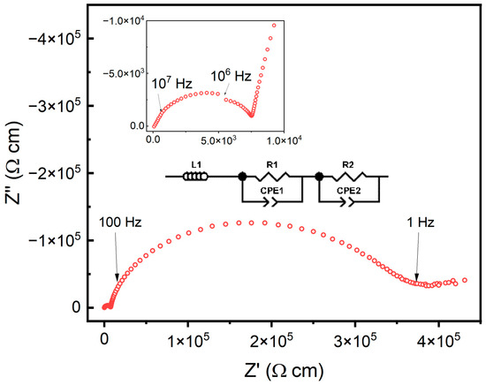Impedance spectra for the 5% doped sample at 250 °C as a representative spectrum for all obtained data. The inset shows the impedance spectra corresponding to the grain. All samples were fit using an equivalent circuit made up of an inductor and two pairs of a resistor and constant phase element in parallel.