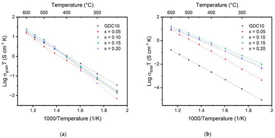 Arrhenius plots showing the (a) grain and (b) total conductivity for doped cerium oxide measured from 250 °C to 600 °C. Data from Omar et al. are included in the figure for the comparison between multication-doped ceria and singly doped ceria (GDC10) [37].