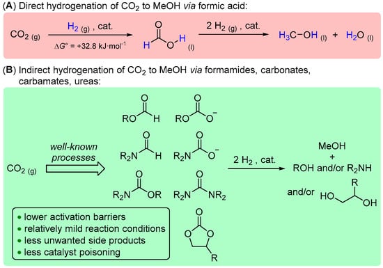 Direct (A) and indirect (B) hydrogenation of CO2 to methanol.
