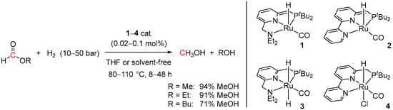Although the synthesis of MeOH via methyl formate was first proposed in 1919, and several heterogeneous catalytic systems for hydrogenation of methyl formate to MeOH under high pressures and temperatures have been reported [,], probably the first example of a homogeneous catalytic system for hydrogenation of alkyl formates to MeOH was demonstrated by the Milstein group in 2011 []. The reactions were performed using a series of Ru-PNN complexes (1–4; Scheme 2) with the maximum turnover number (TON) for MeOH of 4700 (94% yield) observed for the bipyridine-derived catalyst 2 at only 0.02 mol% loading. In THF, 10–50 bar of H2 were required and the optimal reaction temperature was found to be 110 °C. Analogously, 2-catalyzed hydrogenation of ethyl formate and n-butyl formate resulted in 91% and 71% of MeOH, respectively. Notably, at 0.1 mol% loading of 2, methyl formate could be hydrogenated to MeOH with 98% yield (TON = 980) under solvent-free conditions and low temperature (80 °C) and H2 pressure (10 bar), demonstrating a “greener” approach to MeOH production.