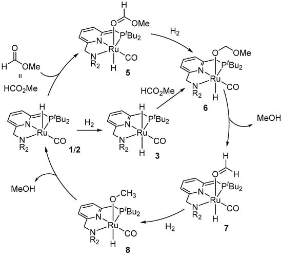 Considering the well-known ability of complex 1 to heterolytically split H2 and produce the dihydride complex 3, and based on the stoichiometric reactivity of 3 with methyl formate, which showed a stepwise formation of the Ru(II) formaldehyde and methoxy species (7 and 8, respectively; Scheme 3), a metal-ligand cooperative (MLC) mechanism for Ru-PNN-catalyzed hydrogenation reactions was suggested. Starting with the dearomatized species 1 or 2, coordination of the methyl formate to Ru gives complex 5. This is followed by the addition of H2 and the hydride transfer to the formate ligand to generate an intermediate 6. The subsequent deprotonation of the benzylic side-arm of the PNN ligand by the methoxy group leads to the release of MeOH and formation of the formaldehyde species 7, which then undergoes hydrogenation to the methoxy complex 8. Lastly, the liberation of MeOH from 8 via ligand dearomatization regenerates the catalyst (Scheme 3). This general mechanistic proposal was further supported by DFT calculations, disclosed by Wang et al. in 2012 [].