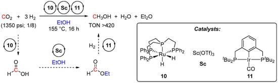 Analogous cascade hydrogenation of CO2 to methanol was also reported by Goldberg et al. in 2019 []. Similarly, the overall process consisted of three steps: CO2-to-FA hydrogenation, FA esterification to HCO2Et, and hydrogenation of the formate intermediate to MeOH. The first two steps employed {P(CH2CH2PPh2)3}Ru(H)2 (10) and Sc(OTf)3 as catalysts, respectively, resembling Sandford’s system. In the third formate-to-MeOH hydrogenation step, in contrast to Sanford’s protocol, instead of an acid-sensitive Ru complex 2, which showed rather a low turnover to MeOH, a more robust Ir(I) complex (PCP)Ir(CO) (11) was employed (Scheme 5). Such greater stability of 11 vs. 2 to Sc(OTf)3 as well as the high thermal stability of 11 allowed tuning of the cascade CO2 hydrogenation to afford > 420 turnovers to MeOH. However, gradual poisoning of catalysts 10 and 11 by CO, formed via decarbonylation of ethyl formate as a side-reaction, was postulated as a TON limiting factor.