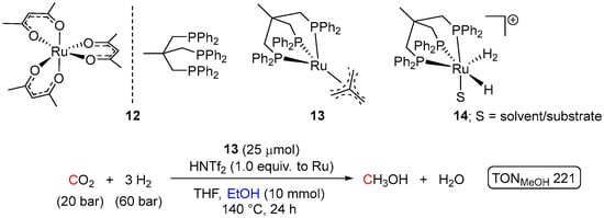 Considering applications of non-pincer Ru systems, Klankermayer and Leitner et al. disclosed one-pot hydrogenation of CO2 to MeOH conducted in THF in the presence of EtOH and catalyzed by a Ru(II) complex bearing a Triphos ligand (Triphos = 1,1,1-tris(diphenyl-phosphinomethyl)ethane) (Scheme 6) []. Initially, the ruthenium pre-catalysts 12 and 13 were tested in the hydrogenation of both methyl and ethyl formates under 50 bar of H2 at 140 °C, showing up to 77 TON to methanol in 24 h. The reactions required acidic conditions to generate a cationic (Triphos)Ru species 14, suggested as the active catalyst. Encouraged by these findings, and considering the well-known ability of Ru(II) phosphine complexes to hydrogenate CO2 to formic acid (FA) and its derivatives [,], one-pot hydrogenation of CO2 in the presence of EtOH and pre-catalysts 10 and 11 was attempted, showing after 24 h at 140 °C the maximum TON of 221 for 11/HNTf2 system (Scheme 6).