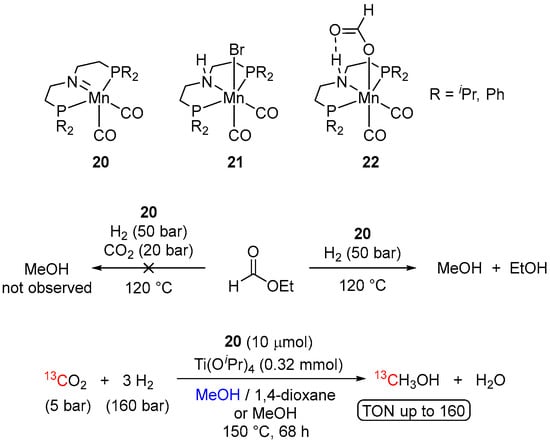 The related reactivity of another bifunctional manganese pincer complex was recently disclosed by Leitner et al. []. The study was performed using an amide Mn(I) complex, (PNP)Mn(CO)2 (20), which could be effectively generated by the treatment of the corresponding amine pre-catalyst (PNHP)Mn(Br)(CO)2 (21) with NaOtBu. Although 20 was capable of hydrogenating ethyl formate to MeOH, no conversion of the formate to MeOH was observed in the presence of CO2 (20 bar). This inhibiting effect of CO2 was rationalized by the formation of a very stable Mn(I) formate intermediate 22 (Scheme 8), blocking the catalytic turnover. The catalytic activity of the system in the hydrogenation of CO2 was unlocked by the addition of alcoholate Lewis acids (Ti(OiPr)4 or Sc(OTf)3), allowing removal of the formate ligand from 22, freeing up of the coordination site at Mn, and efficient generation of the methyl formate intermediate. Thus, conducting 20-catalyzed hydrogenation of CO2 in the presence of Ti(OiPr)4 in either a 1:1 (vol.) mixture of MeOH and 1,4-dioxane or pure MeOH and using 5 bar of 13CO2 and 160 bar of H2 resulted in 68 h at 150 °C in up to 160 TON for 13CH3OH (Scheme 8). The proposed 20-catalyzed reaction pathway resembles the mechanism for 2-catalyzed transformation (Scheme 3) [,]. The detailed mechanistic studies supported by DFT calculations suggested an MLC outer-sphere route with turnover-determining transition states being associated with the concerted activation of H2 by 20 and the Mn-assisted C-O bond cleavage of a hemiacetal intermediate, formed by hydrogenation of the formate [].