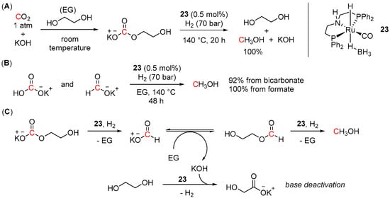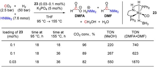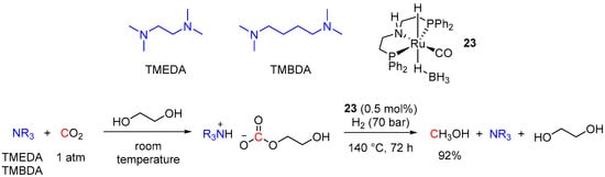 An integrated CO2 trapping and its sequential reduction to MeOH was also reported in 2019 by the Kayaki group []. The catalytic system consisted of (PNHP)Ru(H)(η1-BH4)(CO) (23) and either linear or branched polyethyleneimine (PEI) auxiliaries (Mn = 600–250,000) and allowed production of MeOH without contamination from formate and formamide intermediates. The reactions were conducted in THF in either a sequential or one-pot manner. The latter required heating at above 130 °C and resulted in MeOH production with a TON of 366 using 10 bar of CO2 (the highest TON of 599 was achieved in 100 h at 150 °C applying 20 bar and 60 bar of CO2 and H2, respectively). Interestingly, compared to branched PEI, linear polyamines showed significantly better CO2 uptake upon the N-formylation step (higher CHO content was determined after the reaction due to the absence of inactive tertiary amine linkages); however, the subsequent hydrogenation to methanol was found to be comparatively sluggish. Noteworthy, the use of PEI in 23-catalyzed CO2 reduction allowed for convenient separation of MeOH from amines and FA-derived intermediates, which precipitated upon cooling the reaction mixture and could be filtered off.