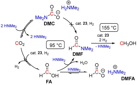 Probably the first example of the homogeneous tandem hydrogenation of CO2 to methanol with an intermediacy of dimethylformamide (DMF) was demonstrated by Sanford and coworkers in 2015 using the ruthenium borohydride catalyst (PNHP)Ru(H)(η1-BH4)(CO) (23; Scheme 9) []. The reactions were conducted with 2.5 bar of CO2 and 50 bar of H2 in the presence of HNMe2, 0.03–0.1 mol% of 23, and 5 mol% of K3PO4 and resulted in 82–96% conversions of CO2 to MeOH with turnover numbers up to 550 (Scheme 9). The proposed reaction mechanism is shown in Scheme 3 and involves a fast reversible formation of dimethylammonium dimethyl-carbamate (DMC) as a CO2 capture step. Due to the very low electrophilicity of the carbonyl group in DMC, its direct hydrogenation to DMF was suggested to be problematic. Instead, the reversible release of CO2 from DMC was proposed, followed by 23-catalyzed hydrogenation of CO2 to formic acid, driven by the amidation of the latter to DMF. In the last step, 23-catalyzed hydrogenation of DMF furnishes MeOH. To achieve the proposed sequence, a single pot temperature ramp strategy was applied, where the reaction mixture was first heated at 95 °C for 18 h to ensure the initial equilibration of DMC and CO2 and 23-catalyzed hydrogenation of CO2 to DMF. Subsequently, the temperature of the reaction was increased, and the next step, 23-catalyzed hydrogenation of DMF to MeOH, was performed at 155 °C for 18–36 h (Scheme 10). Nonetheless, large quantities of the formate [HCO2][H2NMe2] (DMFA) and DMF intermediates (up to 74% yield of the mixture) remained unreacted, which could be attributed to partial decomposition of the catalyst at high temperatures, and further improvements of the system were required to increase the conversion of CO2 to methanol.