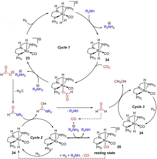 A plausible mechanism for 23-catalyzed amine-assisted sequential hydrogenation of CO2 to methanol was later proposed by Prakash et al. (Scheme 11) []. The reaction was suggested to start with the generation of the ruthenium mono-carbonyl dihydride species 24, converting CO2 to ammonium formate (cycle 1). This is followed by the condensation of the formate intermediate to the formamide product [], which then undergoes 24-catalyzed hydrogenation to hemiaminal (cycle 2). The latter derivative quickly decomposes to the starting amine and formaldehyde, which participates in the third 24-catalyzed cycle to produce MeOH (cycle 3). Under high temperatures, formaldehyde could also decompose to CO, which in turn coordinates to Ru to give a dicarbonyl species [(PNHP)Ru(H)(CO)2]+ (25), observed experimentally and considered as the catalyst resting state. From here, the active Ru dihydride catalyst 24 can be rescued by the addition of H2 and an amine to 25. Notably, based on control experiments with the closely related (PNMeP)Ru(H)(Cl)(CO) (26), in which the N-H was replaced with N-Me, no ligand-assisted H2 transfer to CO2 in the first formate cycle (cycle 1, Scheme 11) was suggested. On the other hand, complex 26 was found to be inactive in the formamide and formaldehyde reduction steps, suggesting an MLC pathway (cycles 2/3, Scheme 11).