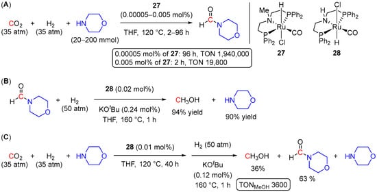 Almost at the same time as Sanford, Ding et al. disclosed a highly efficient N-formylation of a series of primary and secondary amines with H2 and CO2 to give the corresponding formamides using Ru pincer pre-catalysts 27 and 28, with the highest TON of 1,940,000 observed for morpholine (Scheme 12A) []. Notably, the catalyst was recycled up to 12 times without any significant loss of its activity, demonstrating its potential practical applicability. Using complex 28, the produced N-formyl-morpholine was also hydrogenated to MeOH with 94% yield (Scheme 12B). The sequential one-pot strategy for hydrogenation of CO2 to MeOH in the presence of morpholine was also tested and resulted in 36% of MeOH with a TON of 3600 (Scheme 12C). Similarly to Sanford’s approach [], a temperature ramp strategy was applied, resulting in a two-step reaction, where the formation of N-formyl-morpholine was achieved at 120 °C (40 h), followed by the hydrogenation of N-formyl-morpholine to MeOH at 160 °C within 1 h. This temperature ramp was accompanied by the H2 pressure increase from 35 atm in the first step to 50 atm in the second step. Despite moderate yields of MeOH (36%), the developed system shows significant improvement compared to the 23-catalyzed transformation reported by Sanford et al. (Scheme 9) [] and opens further opportunities for integration of CO2 capture and CO2 functionalization approaches under one-pot conditions.