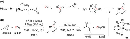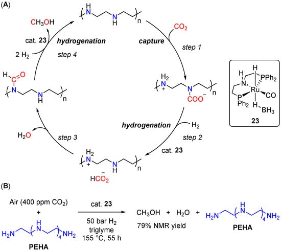 The overall reaction pathway for in situ hydrogenation is depicted in Scheme 13A and includes the PEHA-supported formation of the carbamate (step 1), formate (step 2), and formamide (step 3) intermediates. Notably, after hydrogenation of the formamide intermediate (step 4), the produced MeOH can be separated by a simple distillation, and the catalyst, solvent, and amine were reused up to five times, showing more than 75% of the initial activity after five cycles. Switching from THF to triglyme as the reaction medium, reducing the temperature to 145 °C and applying 75 bar pressure of a 1:9 mixture of CO2/H2, a cumulative TON of 2150 was obtained after five consecutive runs, suggesting potential applicability of the developed method in a flow-type continuous production of MeOH. Lastly, the developed CO2-to-MeOH reduction system was tested in the hydrogenation of CO2 captured from synthetic air (400 ppm of CO2 in N2/O2 80/20; Scheme 13B). After 55 h at 155 °C, a 79% yield of MeOH was observed, demonstrating the first example of a homogeneous system for the capture of CO2 from the air and its direct conversion to methanol. Later on, the same catalyst was applied by Prakash et al. in PEHA-assisted CO2-to-MeOH hydrogenation in a biphasic H2O/2-methyltetrahydrofuran (2-MTHF) system, allowing for simple recycling of the catalyst and the amine without any significant loss in their effectiveness []. Interestingly, compared to PEHA, other polyamine auxiliaries as well as readily available mono-ethanolamine (MEA), showed significantly lower conversions of CO2 to methanol, although comparable (or even greater compared to MEA) effectiveness of some of these amines in the CO2 capture step was observed.
