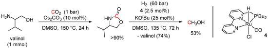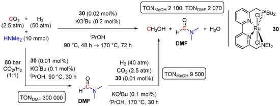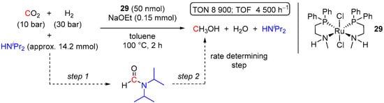 An impressive catalytic CO2 hydrogenation activity of RuCl2(Ph2PCH2CH2NHMe2)2 (29) with HNiPr2 auxiliary was demonstrated by Wass et al. in 2017 []. The reaction was performed in a one-pot manner under rather mild conditions (100 °C, 2 h, 10 bar CO2, 30 bar H2) and low catalyst loading of 50 nmol and showed the selective formation of MeOH, surpassing previously reported homogeneous catalysts in terms of TON (up to 8900) and TOF (up to 4500 h−1) by at least an order of magnitude (Scheme 14).