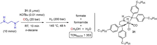 An example of a self–separating multiphasic system for amine-assisted Ru-catalyzed hydrogenation of CO2 to MeOH was disclosed by Franciò and Leitner et al. last year []. The reaction was conducted in n-decane, and the catalyst used resembles complex 23, originally applied by Sanford et al. (see Scheme 2), but long aliphatic chain substituents were introduced to the ligand to ensure its exclusive partitioning into a non-polar organic solvent (complex 31 in Scheme 16). Here, 1,2-dimethylethylenediamine (DMEDA) was used for CO2 trapping, and the reaction mixture was first saturated with CO2 (10 bar) at room temperature. This was followed by heating the mixture under 200 bar of H2 at 145 °C for 48 h leading to a biphasic liquid-liquid system, from which MeOH can be easily separated with the catalyst remaining in n-decane. Although rather harsh hydrogenation conditions were applied, the maximum TON for MeOH of approx. 2000 was obtained, and the developed system allowed for simple catalyst recycling without any significant loss of its activity (total TONMeOH of 19,200 with an average selectivity of 96% over 11 runs).