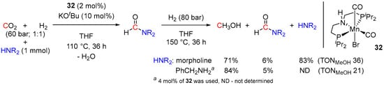 Notably, the nature of the amine auxiliary in 29-catalyzed CO2-to-MeOH hydrogenation had a strong influence on the outcome of the reaction. Gradually decreasing the steric hindrance of an amine from HNiPr2 to HNnPr2, HNEt2, and finally to HNMe2 resulted in decreased MeOH yields, and the formation of large quantities of the corresponding formamide intermediates was detected (from TONamide of 0 for HNiPr2 to 14,000 for HNMe2). Such an improved performance of bulkier amines in the production of MeOH was rationalized by their reduced tendency to bind to the catalyst as well as by faster hydrogenation of bulkier amide intermediates (step 2 in Scheme 14; rate-determining step) [].