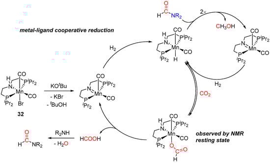 Besides ruthenium, several other more economical 3d metal surrogates have been tested in amine-assisted hydrogenation of CO2 to MeOH [,,], albeit so far these systems generally showed comparatively lower catalytic activities. Thus, by analogy with Ru-PNP catalysts [,,,,], sequential hydrogenation of CO2 in the presence of aliphatic amines and (PNHP)Mn(Br)(CO)2 (32) was reported by Prakash et al. in 2017 (Scheme 17) []. First, the activity of complex 32 at 2 mol% loading was evaluated in the N-formylation of several amines to the corresponding formamides, with the best conversions (93–95% in 24–36 h) observed for morpholine, benzylamine, and N-methylbenzylamine. The reactions were performed in THF at 110 °C under 60 bar of CO2/H2 (1:1) and were initiated by 10 mol% of KOtBu as a base. In the next step, the initial CO2/H2 pressure was released, and the reaction mixtures were subjected to 70–80 bar of H2, followed by heating at 150 °C for 24–36 h. A maximum TON of 36 for the two-step conversion of CO2 to methanol was achieved, which is significantly lower compared to TON values (up to approx. 9000 []) observed for analogous Ru-catalyzed transformations (vide supra) [,,,,,,,]. The proposed mechanism of 32-catalyzed CO2 reduction is depicted in Scheme 18 and is similar to the pathway suggested for (PNHP)Ru(H)(η1-BH4)(CO) (23; Scheme 11 []). However, in the case of Mn, the metal-ligand cooperative reactivity of the catalyst was suggested for all steps, including the generation of the formate intermediate.