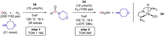 A more recent example of an iron catalyst for sequential amine-assisted hydrogenation of CO2 to MeOH via the formamide intermediate was reported by Bernskoetter et al. []. By analogy with Ru-PNP and Mn-PNP derivatives, (PNP)Fe(H)(CO) (34) was employed as a catalyst, and hydrogenation of CO2 was achieved in a two-step manner (Scheme 20). In the first step, using morpholine as a shuttle and conducting the reaction at 100 °C with CO2/H2 (250/1150 psi) resulted in 83% conversion of CO2 to N-formyl-morpholine with a TON of 1160. The second formamide hydrogenation step was also conducted at 100 °C using 1150 psi of H2 and showed a maximum TON of 590 for MeOH. The catalyst 34 was added at both steps of the transformation. Importantly, completion of the first formylation step required the addition of 3Å molecular sieves to avoid catalyst deactivation by water generated in situ, whereas the addition of LiOTf and DBU was required in the second hydrogenation step to avoid the formation of ammonium carbamates, which seem to inhibit the production of MeOH. Moreover, similarly to the Mn-PNP system reported previously by Parkash et al. [], complex 34 was unable to convert CO2 to MeOH in a single-step manner. Large excess CO2 was required to produce the formamide intermediate but inhibited its turnover to MeOH, presumably due to the formation of the stable [Fe-OC(O)H] resting state [], decarboxylation of which, to produce catalytically active Fe-H species, was suppressed by the excess of CO2.