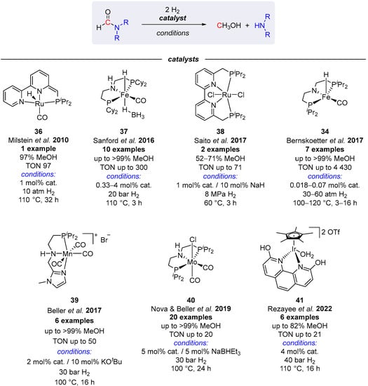 Apart from sequential routes to methanol from CO2 and amines, in which formamides are produced as reaction intermediates, several transition metal complexes have been reported to mediate the production of MeOH from formamides without participation in their formation via N-formylation reactions [,,,,,,]. The best-performing systems for such hydrogenolysis of formamides are summarized in Scheme 21. From these, the highest TON for MeOH was detected for complex 34 [], and others were found significantly less active. Notably, the ruthenium complex 38 was found to mediate the hydrogenolysis of formamides even at 60 °C within 3 h, which represents a rare example of a catalytic system for mild production of MeOH from CO2 derivatives []. It is also noteworthy that 38 was applied in tandem hydrogenation of CO2 to MeOH in the presence of HNMe2 (yield 52%), where RuCl2(PMe3)4 was utilized in the first N-formylation step [].