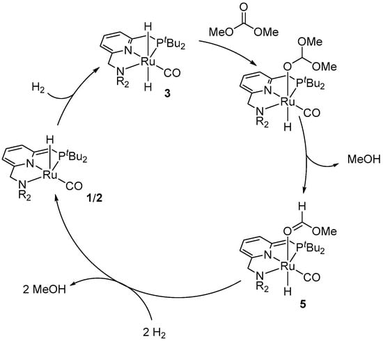 The reduction of dimethyl carbonate catalyzed by complexes 1 and 2 was proposed to proceed via an MLC mechanism (Scheme 23) with an intermediacy of methyl formate [,]. The reaction is initiated by the heterolytic cleavage of H2 by the amide catalysts 1 and 2 to give a dihydride intermediate 3. This is followed by the migratory insertion of the carbonate to the Ru-H bond, the release of a molecule of MeOH, and the formation of the methyl formate complex 5. The latter intermediate reacts with two more equivalents of H2 to recover the catalyst and produce two more equivalents of methanol, according to Scheme 3 above.