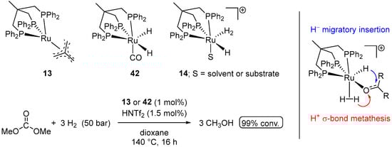 In 2014, Klankermayer and Leitner et al. also demonstrated the hydrogenation of dimethyl carbonate to methanol using Ru Triphos pre-catalysts 13 and 42 (Scheme 24) []. Similarly to 13-catalyzed EtOH-assisted hydrogenation of CO2 to MeOH, the reactions required activation with HNTf2 to generate the catalytically active cationic Ru(II) species 14 [], amenable to the proton transfer from the dihydrogen ligand to the carbonyl group (Scheme 24).