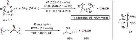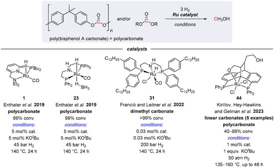 Since 2017, several other examples of Ru-catalyzed hydrogenations of linear carbonates and polycarbonates have been reported [,,,]. These systems are summarized in Scheme 26, and all operate via MLC pathways. Thus, complexes 1, 23, and 44 were applied in hydrogenative depolymerization of a bisphenol A-derived polycarbonate, routinely used in protective CD/DVD films [,,]. The reactions afforded MeOH and bisphenol A as the products of the carbonate linkage cleavage, although rather large quantities of KOtBu (1 equiv.) were required in the 44-catalyzed reaction. On the other hand, the use of the lipophilic PNP derivative 31 in the hydrogenation of dimethyl carbonate in n-decane allowed for efficient catalyst separation and reuse. Although the reactions were conducted with only 0.03 mol% loading of 31, high H2 pressure of 200 bar was required to fully convert Me2CO3 to MeOH [].