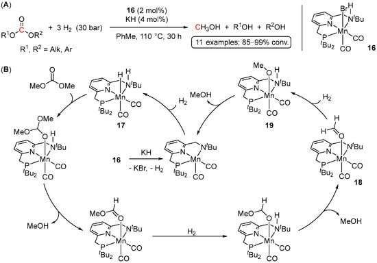 (A) Hydrogenation of Me2CO3 to MeOH catalyzed by Mn(I) complex 16; (B) a plausible metal–ligand cooperative mechanism for 16-catalyzed hydrogenation of methyl carbonate.