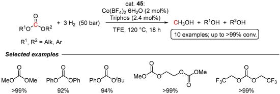 The first example of cobalt-catalyzed hydrogenation of carbonates has been recently demonstrated by Beller and co-workers []. A series of commercially available Co(II) and Co(III) salts and polydentate phosphine ligands have been tested, with Co(BF4)2·6H2O/Triphos (45) being the most active. Several symmetric and non-symmetric acyclic carbonates were efficiently hydrogenated to MeOH and the corresponding alcohols using 2 mol% of Co loading and 50 bar of H2. Almost quantitative conversions were achieved in 2,2,2-trifluoroethanol (TFE) at relatively mild and additive-free conditions (120 °C, 18 h; Scheme 28). Similarly to previous reports on the hydrogenation of linear carbonates, the reactions were proposed to proceed via formate and formaldehyde intermediates.