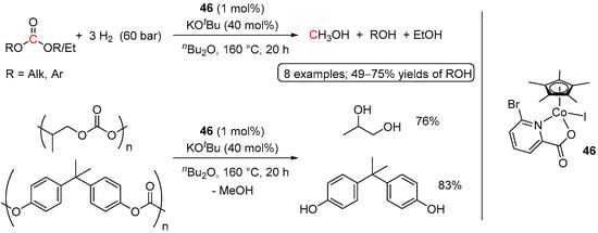 - Dahiya, P.; Gangwar, M.K.; Sundararaju, B. Well-defined Cp*Co(III)-catalyzed Hydrogenation of Carbonates and Polycarbonates. ChemCatChem 2021, 13, 934–939. [Google Scholar] [CrossRef]
