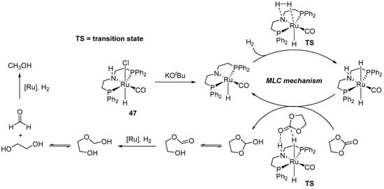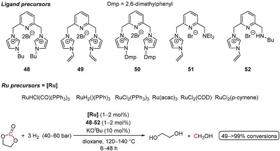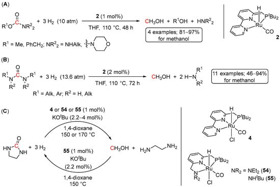 The first example of homogeneous catalytic hydrogenation of dimethyl carbonate along with other CO2 derivatives (such as formates and carbamates) was reported by Milstein in 2011 using Ru-PNN pincer complexes 1 and 2 (Scheme 22) []. The reactions were tested in either 1,4-dioxane or THF at 10–60 bar of H2 and 100–145 °C. The maximum TON of 4400 for methanol was achieved using only 0.05 mol% of the catalyst 2 and conducting the hydrogenation at 50 bar of H2 and 110 °C for 14 h. Remarkably, 2-catalyzed reduction of Me2CO3 to MeOH with TON > 990 was also performed using only 10 bar of H2 under neat conditions.
