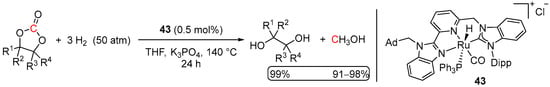 Yet another Ru(II) pre-catalyst 43 for the hydrogenation of dimethyl carbonate to methanol was reported by Chen et al. in 2017 (Scheme 25) []. The system resembled the Milstein-type catalysts 1–4 [], where the phosphine side-arm of the ligand is replaced with the N-heterocyclic carbene (NHC) donor. The reduction of dimethyl carbonate was conducted with 50 bar of H2 at 140 °C using 0.5 mol% of 43 activated with K3PO4 and resulted in >99% conversion to MeOH within 24 h. The same system was also found to be highly active in the hydrogenation of cyclic carbonates (vide infra). The suggested mechanism likely involves base-assisted dearomatization of the pyridine ligand following the general scheme proposed previously by Milstein et al. (see Scheme 23) [].