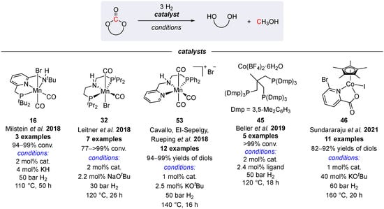 - Kaithal, A.; Hölscher, M.; Leitner, W. Catalytic Hydrogenation of Cyclic Carbonates using Manganese Complexes. Angew. Chem. Int. Ed. 2018, 57, 13449–13453. [Google Scholar] [CrossRef]