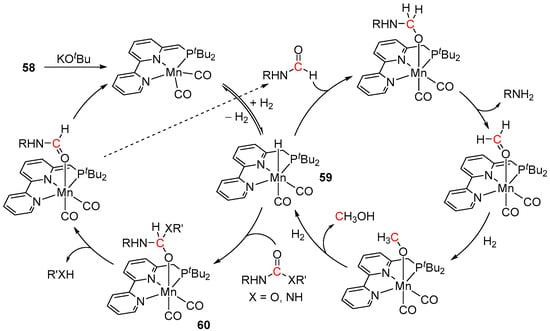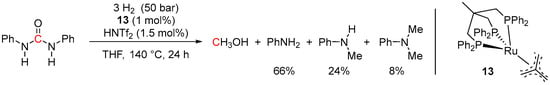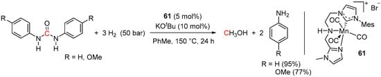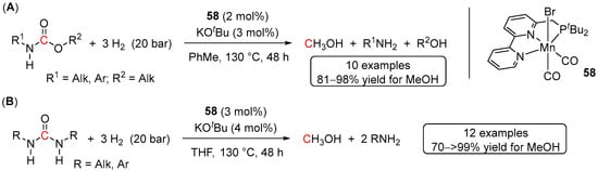 - Das, U.K.; Kumar, A.; Ben-David, Y.; Iron, M.A.; Milstein, D. Manganese Catalyzed Hydrogenation of Carbamates and Urea Derivatives. J. Am. Chem. Soc. 2019, 141, 12962–12966. [Google Scholar] [CrossRef] [PubMed]