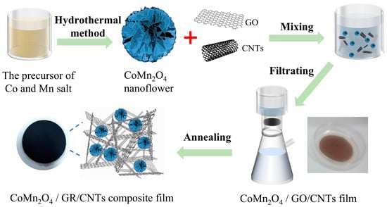 The preparation of graphene oxide (GO) was achieved using an improved Hummers method [28] through a three-step process: low-temperature oxidation, high-temperature oxidation, and hydrolysis. Firstly, 1 g of graphite powder provided by the China National Pharmaceutical Group Co. was added to a mixture of 92 mL of concentrated sulfuric acid (95–98%) and 24 mL of nitric acid (65%) in a 500 mL flask placed in an ice bath. The suspended solution was vigorously stirred at 0 °C for 1h, constituting the low-temperature oxidation process. Next, to further enhance the oxidation degree of the graphite, the mixture was heated to 80 °C for 30 min, representing the high-temperature oxidation step. Following that, 92 mL of deionized water was slowly added and the suspension was stirred at 80 °C for an additional 30 min, concluding the hydrolysis process. Afterward, to reduce the remaining permanganate, 5 mL of H2O2 (30%) was added to the solution. Upon completion of the reaction, the resulting mixture was washed with a 5% solution of HCl and water until no sulfate was detected with BaCl2. Finally, the GO powders were dried at 80 °C for 24 h, completing the post-treatment steps of drying and washing. The GO (20 mg) and the carbon nanotube (CNT) (10 mg) provided by Zhongke Times Nanomaterials Co., Ltd. were dispersed in 10 mL of deionized water by ultrasonication. The resulting suspension was stirred continuously for 12 h on a magnetic stirrer after adding 20 mg of the as-prepared CoMn2O4. The suspension was then transferred to a vacuum filtration apparatus (1000 mL) and continuously filtered for 4 h. The resulting thin film was transferred to a petri dish and briefly soaked in acetone solution. The synthesized thin film was then quickly peeled off from the microporous membrane using forceps. Finally, the peeled thin film was calcined at 220 °C for 2 h and the resulting CoMn2O4/GR/CNT composite film was synthesized.