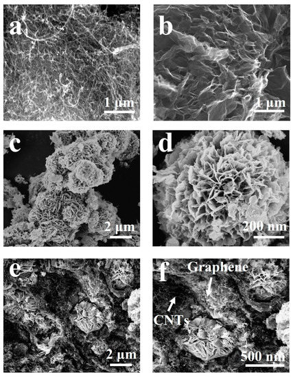 Figure 2. The SEM images of as-prepared (a,b) CNT and GR, (c,d) CoMn2O4 nanoflower particles, and (e,f) CoMn2O4/GR/CNT composite film.