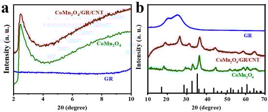 To determine the phase composition of the as-prepared materials, X-ray diffraction (XRD) analysis were carried out on the as-synthesized GR, CoMn2O4 microflowers, and the CoMn2O4/GR/CNT composite film. Figure 3a shows the low-angle X-ray diffraction (XRD) patterns of the as-prepared materials within the range of 2–10°. Upon analysis of the XRD patterns, it was observed that the GR exhibits a relatively featureless pattern in this low-angle range, with no distinct peaks observed. This indicates the amorphous nature or very fine crystalline structure of the graphene. In contrast, the CoMn2O4 nanoflower particles exhibit a characteristic peak at approximately 2.46°, suggesting the presence of a crystalline phase in the material. Interestingly, in the XRD pattern of the CoMn2O4/GR/CNT composite film, a peak is observed at the same position as the CoMn2O4 nanoflower particles. However, this peak appears to be slightly broadened compared with the pure CoMn2O4, indicating a potential modification in the crystalline structure or an influence from the presence of GR and CNT. From the wide-angle XRD diffractogram of GR in Figure 3b, it is evident that a diffraction peak is observed around 25°, which corresponds to the (002) crystal plane of graphene. This peak signifies that GR possesses an amorphous structure with no prominent crystalline peaks observed within the low-angle range of 2–10°. The pure CoMn2O4 nanoflowers (represented by the green line) showed diffraction peaks at 2θ = 18.2°, 29.3°, 31.2°, 32.9°, 36.4°, 4.8°, 59.0°, and 60.7°, corresponding to the (111), (202), (220), (113), (311), (400), (511), and (404) crystal faces, respectively, consistent with the PDF card (JCPDS 23-1237), with no other impurity peaks appearing, indicating the high purity of CoMn2O4. The brown line in Figure 3 represents the CoMn2O4/GR/CNT film. In the CoMn2O4/GR/CNT composites, some of the XRD peaks have become broader and less distinct. This could be attributed to the introduction of graphene and carbon nanotube that could have caused some lattice distortion and reduced the crystallinity of the CoMn2O4 nanoparticles. However, the main diffraction peaks of CoMn2O4 were still identifiable, indicating that the introduction of GR/CNT did not significantly affect the crystal structure of CoMn2O4.