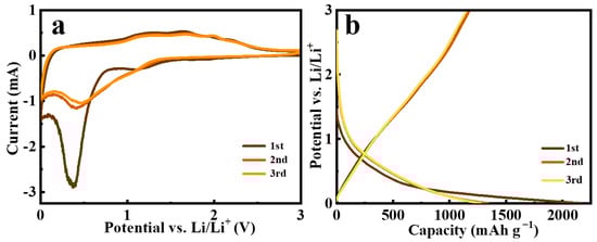Figure 4. Electrochemical performance of CoMn2O4/GR/CNT film for LIBs at room temperature (25 °C). (a) Cyclic voltammograms between 0.0 V and 3.0 V at a scan rate of 0.1 mV s−1 for the initial three cycles. (b) Charge–discharge voltage profiles at a current density of 0.1 A g−1 for the initial three cycles.