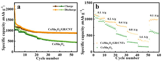 A galvanostatic charge–discharge test was conducted to further evaluate the electrochemical performance of the CoMn2O4 and CoMn2O4/GR/CNT composite film electrodes. The cycling performance of CoMn2O4 and CoMn2O4/GR/CNT at a current density of 100 mA g−1 for the first 55 cycles is presented in Figure 5a. The initial discharge specific capacities of the CoMn2O4 and CoMn2O4/GR/CNT films were 1514 and 2148 mAh g−1, respectively. Although the difference in specific capacity between CoMn2O4 and CoMn2O4/GR/CNT films was not significant during the first few cycles, the discharge specific capacity of the CoMn2O4 electrode decreased rapidly with increasing cycle number. After 55 cycles, the discharge specific capacity of the CoMn2O4 electrode was only 457 mAh g−1, which was about half of that of the CoMn2O4/GR/CNT material (881 mAh g−1) under the same testing conditions. The discharge specific capacity of CoMn2O4GR/CNT composites decreases very slowly and reaches a stable plateau after about 15 cycles. The enhanced electrochemical performance can be attributed to the synergistic effect of the three-dimensional network structure of GR/CNT and the highly dispersed CoMn2O4 nanoflowers, which provides a large surface area and efficient electron and ion transport pathways. Furthermore, the introduction of GR/CNT effectively alleviates the volume expansion and agglomeration of CoMn2O4 during the charge–discharge process, maintaining the integrity and activity of CoMn2O4 during the stability test.