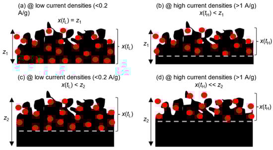 Schematic variation of the electrolyte-accessible region with the current density for low—(a,b)—and high—(c,d)—mass loading electrodes. z1 and z2 are the thicknesses of the low and high mass loading electrodes (z2 > z1). tL and tH are the charging times at low and at high current densities (tL > tH). x(tL) and x(tH) are the electrolyte penetration depths enabled by charging times tL and tH, (x(tL) > x(tH)).