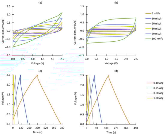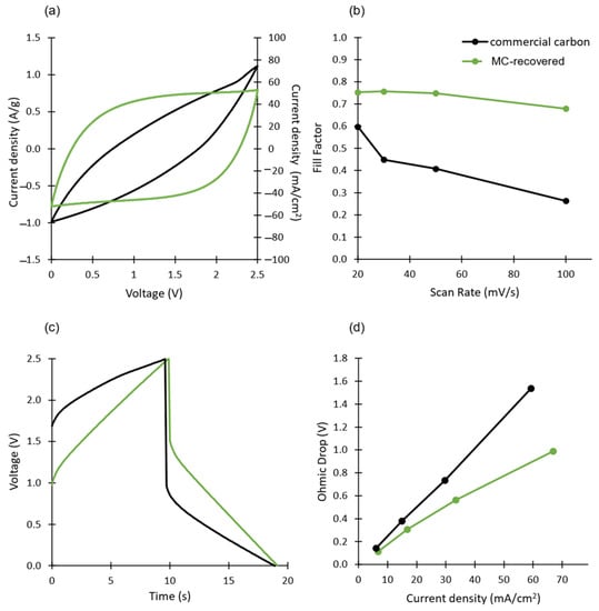 Figure 3 shows, both for commercial carbon and for MC-recovered carbon, voltammograms obtained at increasing scan rates (Figure 3a,b, respectively) and galvanostatic charge–discharge curves obtained at increasing current densities (Figure 3c,d, respectively). At low rates, the voltammograms of commercial carbon (Figure 3a) are fairly rectangular and have a larger area; however, as the scan rate increases, their shape approaches that of an elongated ellipse (suggesting a high resistivity). Similarly, the charge–discharge curves show that whilst, at low current densities, commercial carbon cells have a longer (dis)charge period (which indicates a higher capacitance), their performance decreases rapidly with increasing current densities (resulting in large ohmic drops). On the contrary, the cells prepared with MC-recovered carbon manage to retain highly rectangular voltammograms (even at 100 mV/s), and their charge–discharge plots have consistently lower ohmic drops.