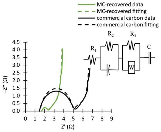 As for the “capacitor” in parallel with R2, given the imperfect nature of the double-layer, it is actually more accurately modeled by a constant phase element (CPE). This circuit component has two features: its magnitude and its dispersion coefficient (N). The latter varies between 0 and 1: for N = 0, the element behaves like a perfect resistor, whilst, for N = 1, it behaves like a perfect capacitor [24]. In this case, N is quite high (N = 0.9), meaning that the magnitude of the CPE (in this case, represented as an admittance) can be roughly correlated with a capacitance. Because the magnitude of the CPE is larger for the MC-recovered carbon than for the commercial carbon, this suggests that the former has a higher capacitance at high frequencies (which further confirms the higher rate capability of this material).