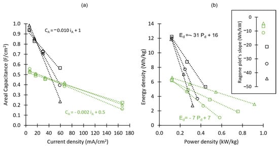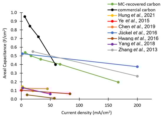 The results observed in Figure 6a are reinforced in Figure 6b, which compares the Ragone plots obtained for the two types of devices. Due to a decrease in the capacitance and to an increase in the ohmic drop, the energy and power densities of the commercial carbon device are highly degraded at high rates (the slope of the Ragone plot is −31 Wh/kW). For MC-recovered carbon, good performance is retained at high rates (the Ragone plot’s slope is only −7 Wh/kW). This metric is useful in comparing the performances of devices with similar thicknesses [27]. However, for devices with very different mass loadings (which is often the case when comparing literature-reported results), it is preferable to compare the areal capacitances at increasing current densities, as shown in Figure 7. It is worth stressing that all the areal capacitances reported were normalized by the footprint area (i.e., not by the BET surface area).
