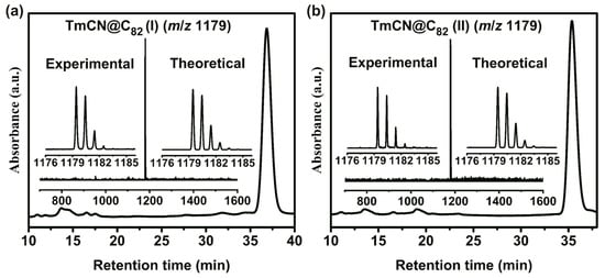 HPLC chromatograms of purified (a) TmCN@C82 (I) and (b) TmCN@C82 (II), obtained using an analytical Buckyprep column with toluene as the eluent and a flow rate of 1 mL/min. The inserts show the mass spectra of two TmCN@C82 isomers with experimental versus theoretical isotopic distributions.