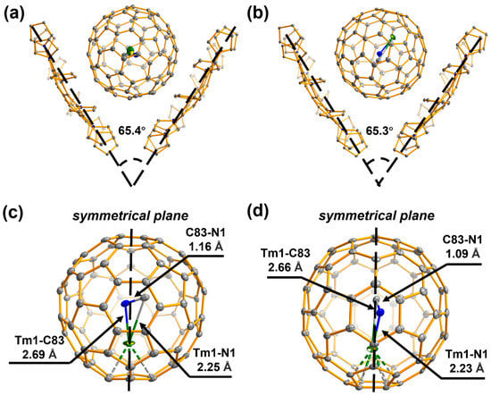 The molecular structures of the TmCN@C82 (I) and TmCN@C82 (II) were precisely characterized as TmCN@Cs(6)-C82 and TmCN@C2v(9)-C82, respectively, via single-crystal X-ray diffraction and through their co-crystalization with decapyrrylcorannulene (DPC) molecules, which enhance the crystallinity of EMFs []. Both co-crystals were found to crystallize in P21/c, a space group of No. 14, which is commonly seen in the EMF-DPC co-crystallization systems, and the utilization of the low-symmetry primitive lattice for the EMF-DPC co-crystals could effectively circumvent the “crystallographic mirror dilemma” that generally appears in the EMF-NiII(OEP) co-crystals crystalized in the C2/m space group []. As shown in Figure 2a,b, the TmCN@C82 isomers were co-crystallized with two DPC molecules, exhibiting a distinctive V-shaped configuration with a dihedral angle of about 65°. The closest C···C distances between both TmCN@C82 isomers and the DPC molecules were measured to be ~3.37 Å; this is close to the interlayer spacing observed in graphite (3.35 Å), suggesting their π–π stacking interactions.